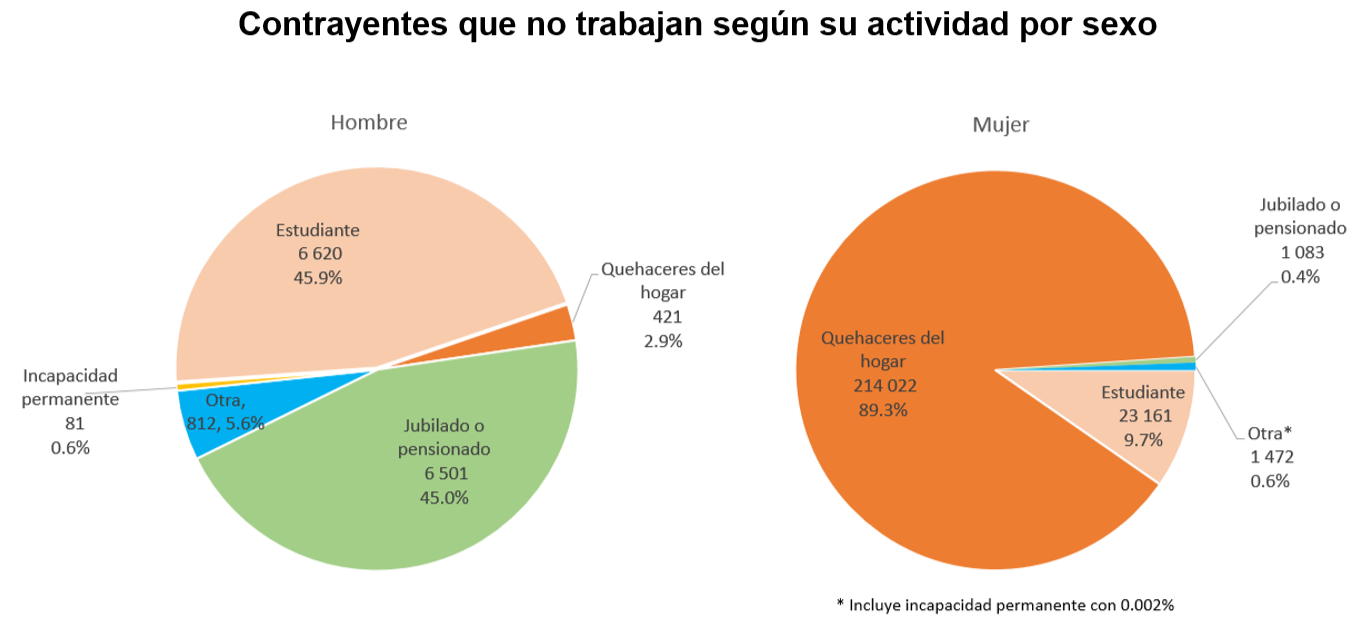 Las principales actividades a las que se dedican los contrayentes que no contaban con trabajo al momento de contraer nupcias, son los quehaceres del hogar con un 89.3% (214 022) con un aumento del 0.5% y la de estudiante con 9.7% (23 161) se observa una baja del 0.4%, quienes son mayormente mujeres.
