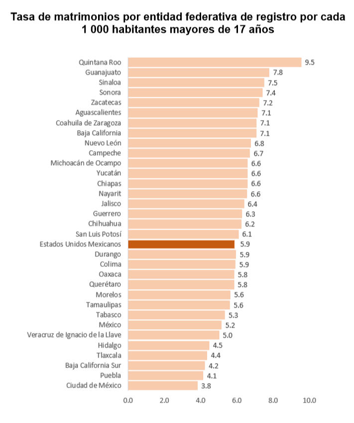 Las entidades federativas que presentan las tasas más altas de matrimonios por cada mil habitantes mayores de 17 años son Quintana Roo (9.5), Guanajuato (7.8), Sinaloa (7.5) y Sonora (7.4). Las que presentan las tasas más bajas son Ciudad de México (3.8), Puebla (4.1), Baja California Sur (4.2) y Tlaxcala (4.4). Aguascalientes tiene una tasa de 7.1 por cada mil habitantes mayores de 17 años.
