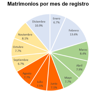 El mes que registró el mayor número de matrimonios fue febrero con 13.6% (68 214) seguido de diciembre con 10.9% (54 415) y marzo con 8.4% (41 903), se presentan en los mismos meses que el año anterior, donde se observa el mayor descenso fue en diciembre con 3% de diferencia.