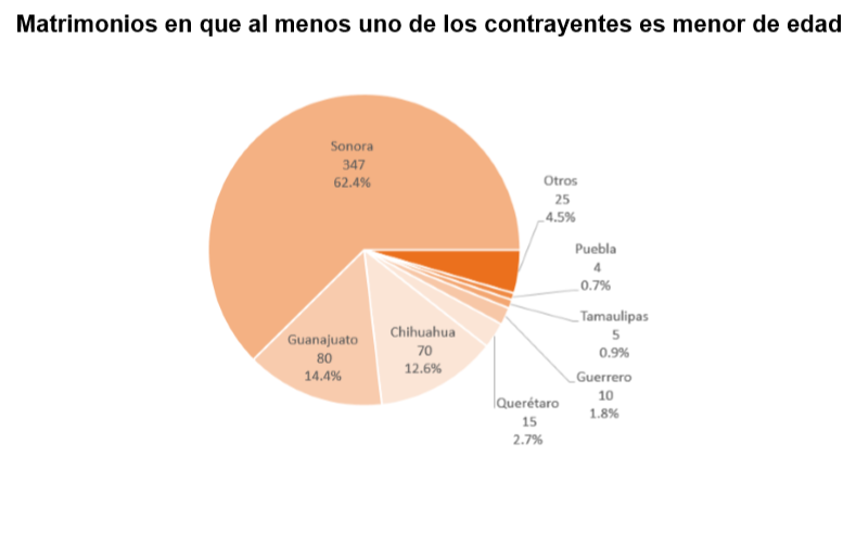 De los 556 matrimonios en los que al menos uno de los contrayentes es menor de edad, los estados con la mayor proporción son Sonora 62.4% (347), Guanajuato 14.4% (80), Chihuahua 12.6% (70), Querétaro 2.7% (15) y Guerrero 1.8% (10), esta práctica va a la baja debido a que a partir de 2016 se ha impulsado un proceso para impedir el matrimonio en el que participen personas menores de 18 años.