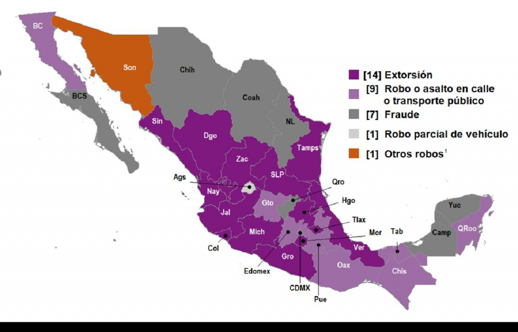 Tanto en México como en Aguascalientes, uno de cada tres habitantes reconoció haber sido víctima de la delincuencia durante los últimos 12 meses de la aplicación de la encuesta. La Envipe estima que durante 2018 se generaron 33 millones de delitos asociados a 24.7 millones de víctimas. Esto representa una tasa de 1.3 delitos por víctima. El delito más frecuente en Aguascalientes a diferencia de todos los estados que lo rodean es el robo parcial de vehículo. Para el resto, es básicamente la extorsión. Los datos específicos de los hechos nos hablan en concreto sobre la Seguridad Pública.