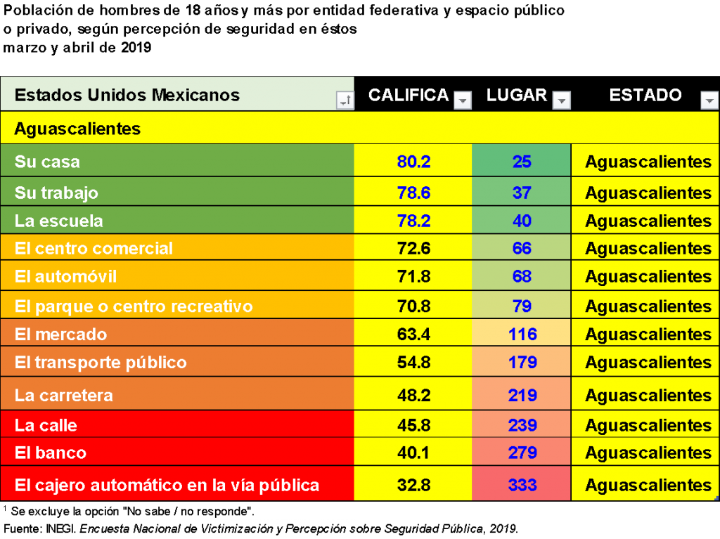 Por estas calificaciones, el estado de Aguascalientes termina como tercer lugar nacional en percepción de seguridad debajo de Yucatán y Baja California Sur; desde sus municipios el posicionamiento está dentro de los primeros cinco.