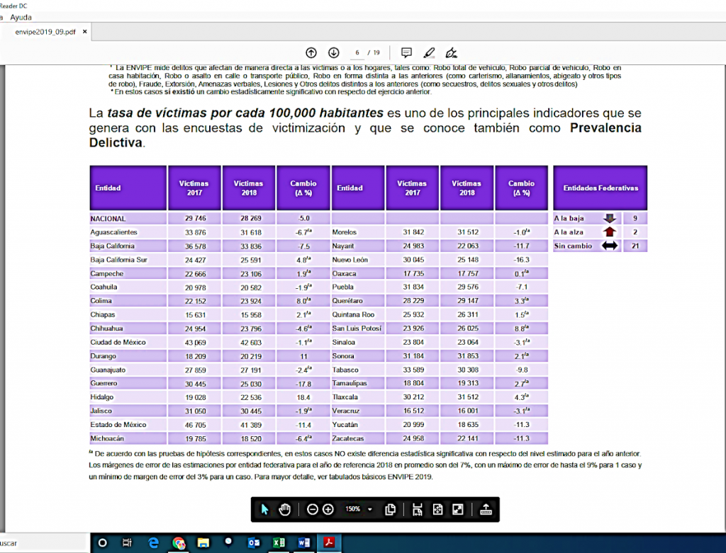 La Encuesta Nacional de Victimización y Percepción de la Seguridad Pública (Envipe) 2019 del Inegi, no sólo conoce la percepción sobre la seguridad que las personas mayores de edad tienen con relación a los espacios público y privado que habitan o comparten. La Envipe logra hacer estimaciones puntuales sobre las víctimas de la violencia cuya suma asciende a 24.7 millones de víctimas de 18 años y más, lo cual representa una tasa de prevalencia delictiva nacional de 28,269 víctimas por cada cien mil habitantes durante el año 2018, cifra estadísticamente inferior a la estimada en 2017.