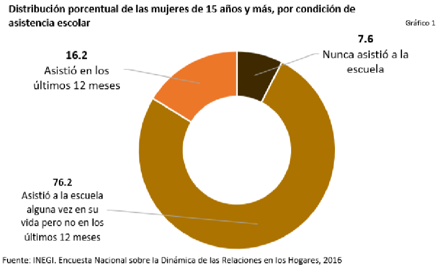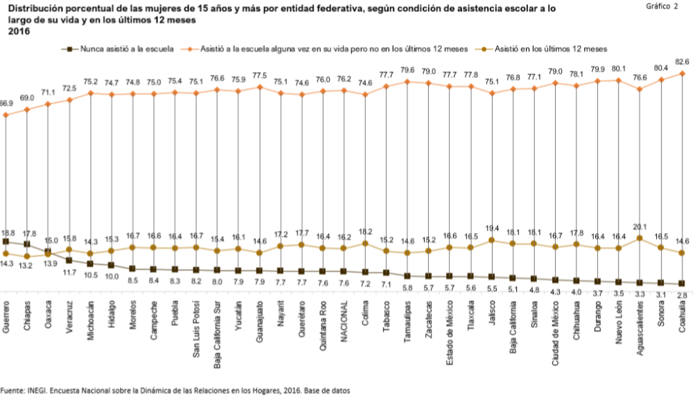 A finales de 2016, en el ámbito nacional 7.6% de las mujeres nunca ha asistido a la escuela a recibir educación, tres cuartas partes (76.2%) han asistido alguna vez, pero no de manera reciente en los últimos 12 meses, mientras que 16.2% sí asistió de manera reciente a la escuela. En el ámbito estatal Guerrero, Chiapas, Oaxaca, Veracruz, Michoacán e Hidalgo presentan proporciones entre el 10.0 y 18.8%, en tanto que ocho entidades se ubican en proporciones por debajo del 5.0%: Sinaloa, Ciudad de México, Chihuahua, Durango, Nuevo León, Aguascalientes, Sonora y Coahuila.