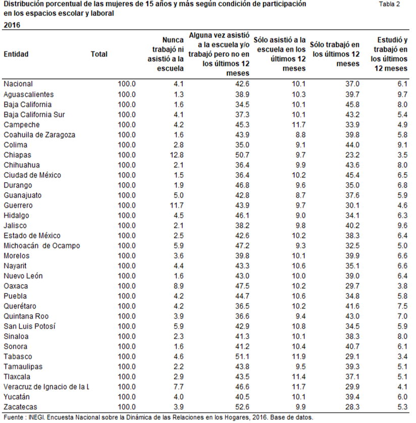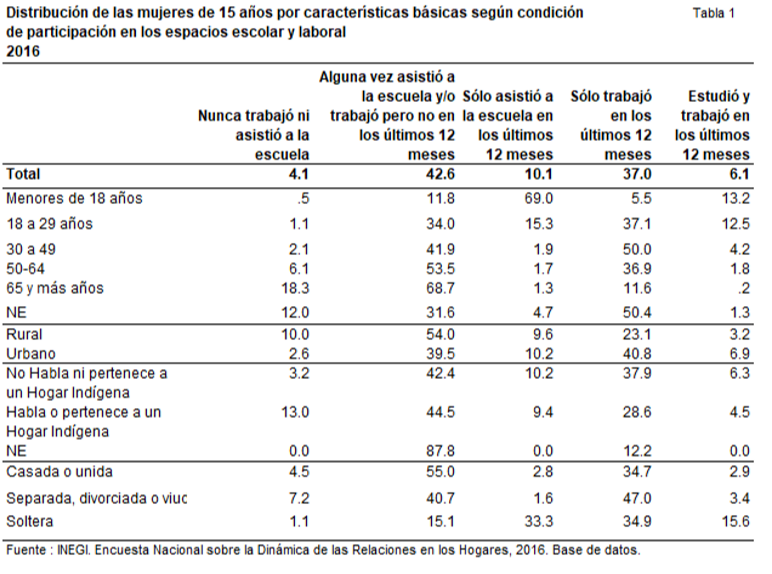 En el ámbito nacional la información indica que 96.9% de las mujeres ha asistido a la escuela o trabajado alguna vez en su vida, pero solo un poco más de la mitad lo hizo en los últimos 12 meses. Sin embargo, los datos muestran que esta situación varía en función de la entidad, la edad, si las mujeres viven en localidades rurales o urbanas o bien si son hablantes de una lengua indígena o pertenecen a un hogar indígena, lo que muestra situaciones diferenciadas y de mayor desigualdad.