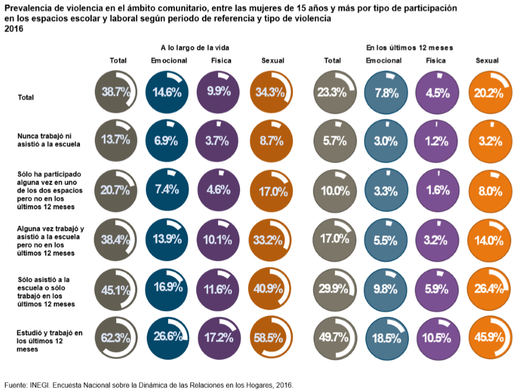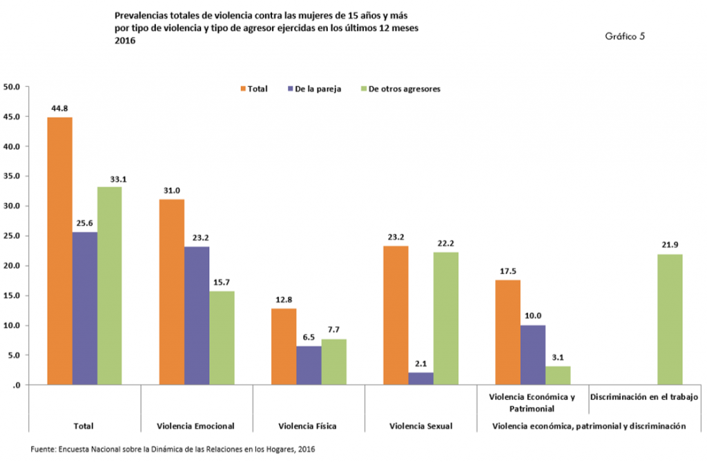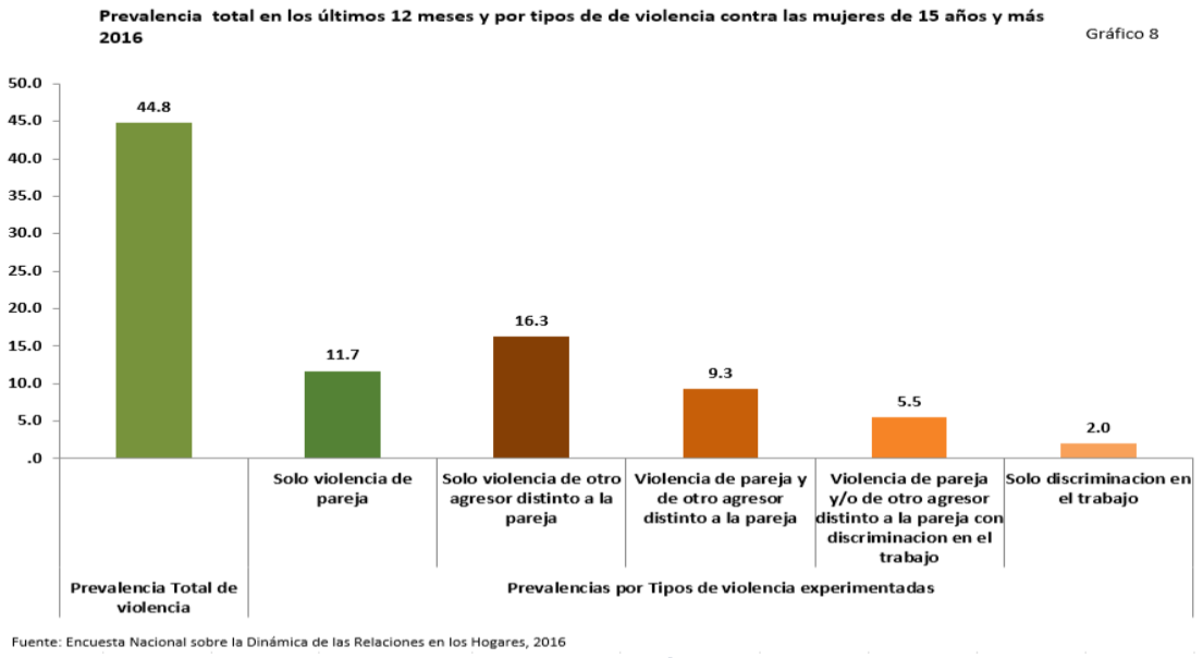 En cuanto a la violencia que experimentaron las mujeres en los 12 meses anteriores a la encuesta, entre octubre de 2015 y octubre de 2016, 45 de cada 100 mujeres fueron víctima de algún acto violento, principalmente de tipo emocional, sexual y discriminación en sus centros de trabajo. En el caso de la violencia emocional el perpetrador es principalmente la pareja o expareja última, mientras que la violencia sexual ha sido ejercida por diversos agresores distintos a la pareja.