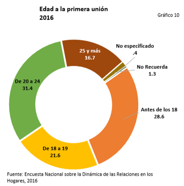 En promedio el 28.6% de las mujeres de 15 años y más se casó o unió por primera vez antes de los 18 años, y antes de cumplir 20 años, la mitad ya estaba cohabitando con una pareja.