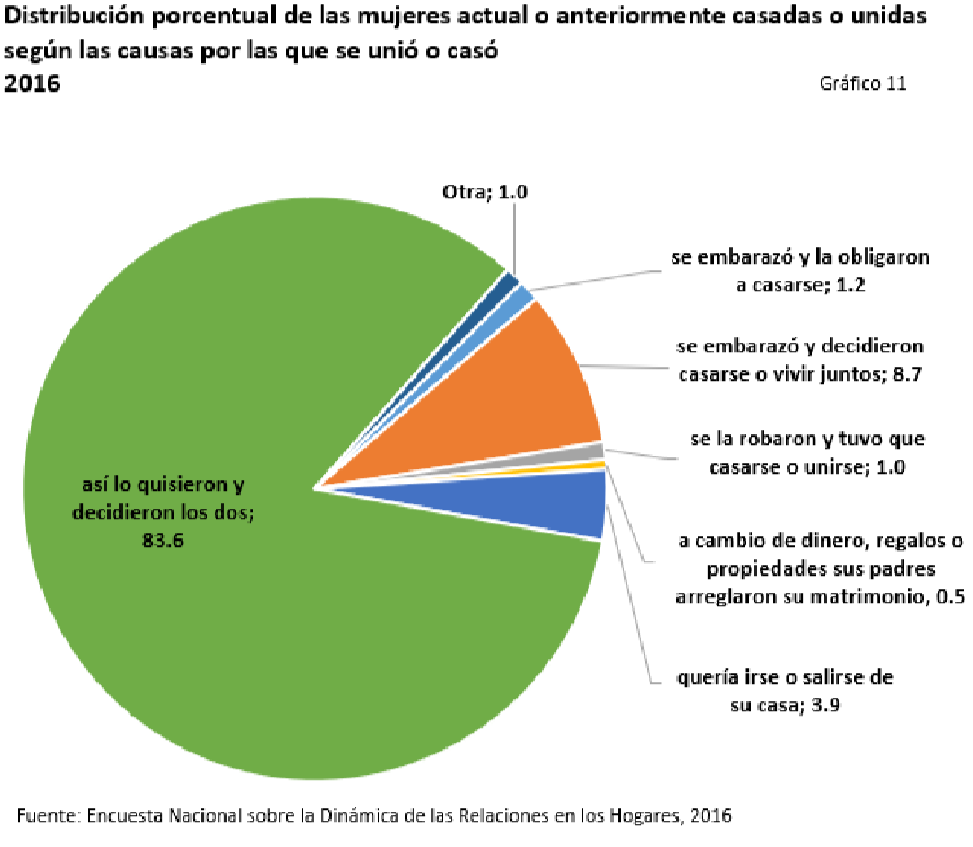Entre las causas por las que las mujeres se casaron o unieron destacan dos elementos importantes: Si bien la mayoría lo hizo por su propia voluntad (83.6%), 2.7% de las mujeres se unió a su actual esposo o pareja porque fue obligada a hacerlo ya sea porque se embarazó, se la robaron o bien porque se arregló su unión a cambio de dinero o bienes. Esta proporción asciende a 4.9% entre quienes se casaron antes de los 18 años, y aunado a ello, el 9.2% se tuvo que casar porque se embarazó.