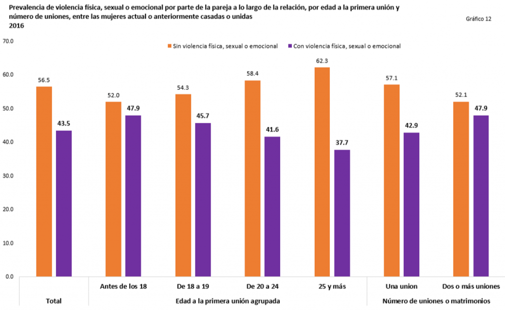 El instituto también indica que el 43.9% de la mujeres en el país ha enfrentado agresiones del esposo o pareja actual o la última a lo largo de su relación y está más acentuado entre las mujeres que se casaron o unieron antes de los 18 años (48.0%), que entre quienes lo hicieron a los 25 o más años (37.7%).
