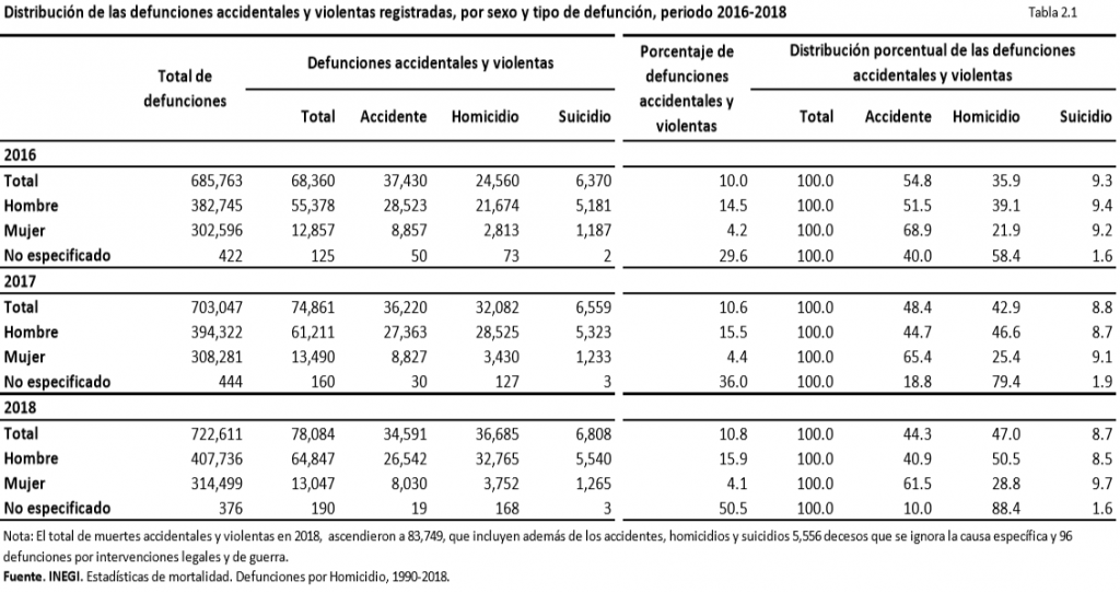 En el trienio de 2016-2018, se registró el fallecimiento de 2 millones 111 mil 421 personas, de las cuales 43.8% eran mujeres. De estas defunciones, las ocurridas por causas accidentales y violentas ascendieron en promedio anual a 73,768 personas, es decir uno de cada 10 decesos fue por causas accidentales o violentas.