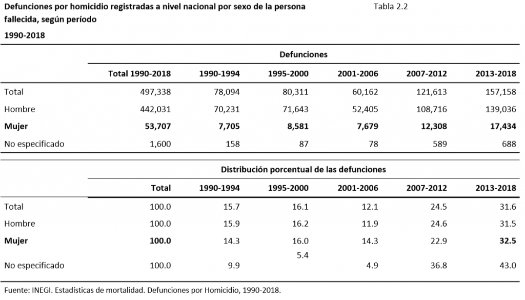 En 2018 se registraron en México 3,752 defunciones por homicidio de mujeres, el más alto registrado en los últimos 29 años (1990-2018), lo que en promedio significa que fallecieron 10 mujeres diariamente por agresiones intencionales.