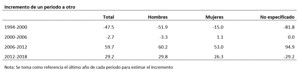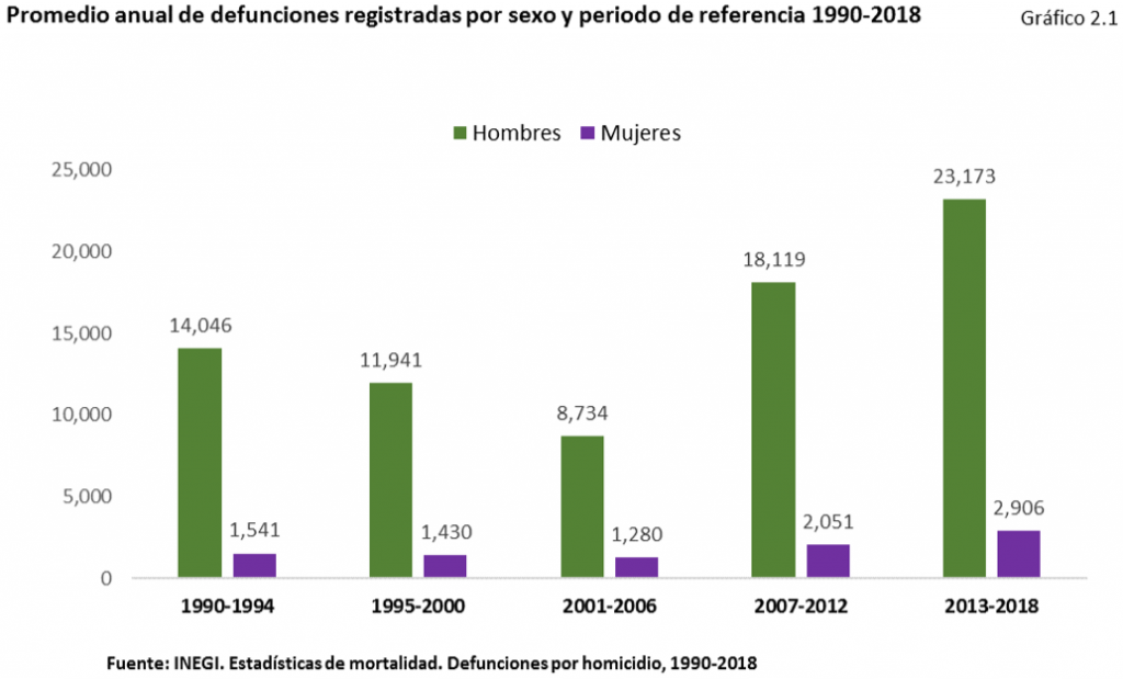 De acuerdo con el promedio anual de las defunciones por homicidio registradas en cada periodo, el más bajo se observa en el sexenio 2001-2006, tanto para hombres como para mujeres, que representa el promedio anual más bajo de los últimos 29 años. Por el contrario, el más alto ocurrió en los últimos seis años (2013-2018).