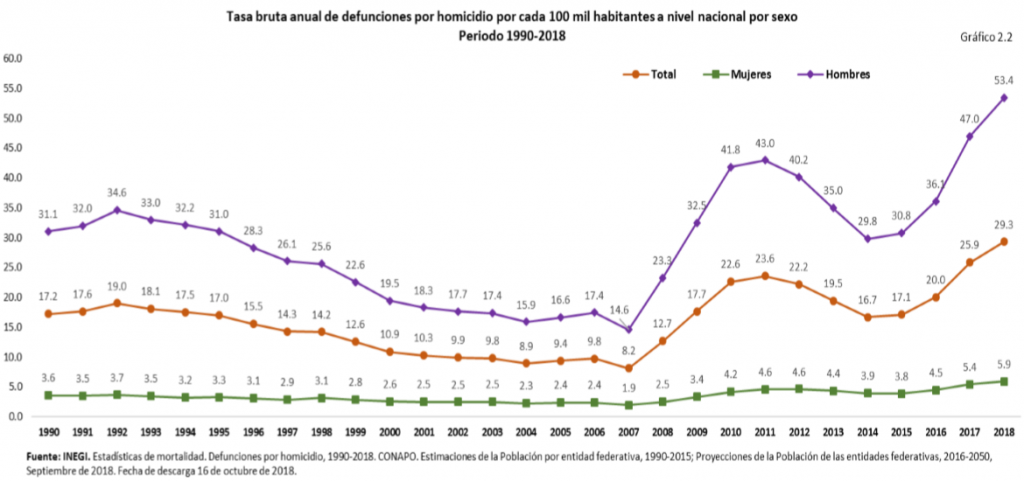 El número de mujeres asesinadas durante 2018 es el más alto registrado en los últimos 29 años -1990 a 2018- por encima de los registrados en 2009 (1,925), que representa el año en que se rompió el umbral de los 1,623 registrados en 1992 que fue el más alto del periodo de 1990 a 2008. En 10 años 2009-2018, se duplicó el número histórico de 1,623 mujeres fallecidas por agresiones intencionales.