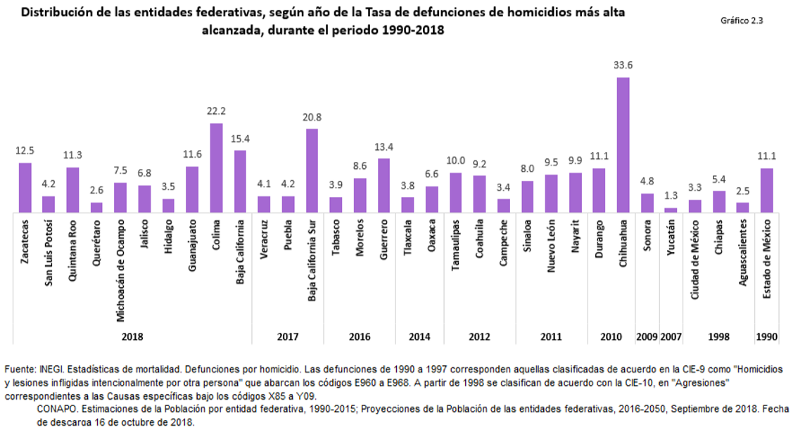 Si se revisa la tendencia de las tasas por entidad se observa que durante 2018, 10 entidades registraron su tasa más alta de los últimos 29 años –Baja California, Colima, Guanajuato, Hidalgo, Jalisco, Michoacán de Ocampo, Querétaro, Quintana Roo, San Luis Potosí y Zacatecas – siete de ellas se ubican actualmente con las tasas más altos del país: Baja California, Colima, Guanajuato, Jalisco, Michoacán de Ocampo, Quintana Roo y Zacatecas. En San Luis Potosí, Querétaro e Hidalgo, si bien registraron las tasas más altas de su historia reciente, en 2018 su tasa se ubica por debajo de la media nacional.