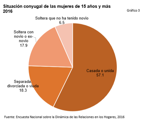 Sin duda, una característica importante a tener en cuenta es la situación conyugal de las mujeres y la situación de relación de pareja, en el caso de las solteras. Del total de las mujeres de 15 años y más, el 93.3% mantiene o mantuvo una relación de pareja, ya sea por unión o matrimonio (57.1% están actualmente casadas o unidas y 18.3% actualmente están separadas, divorciadas o viudas de su última relación con quien estuvieron casadas o unidas), o bien de pareja o noviazgo sin cohabitar (17.9%); y solo 6.5% no ha tenido ninguna relación de pareja.