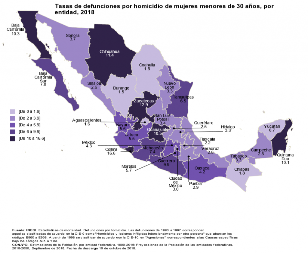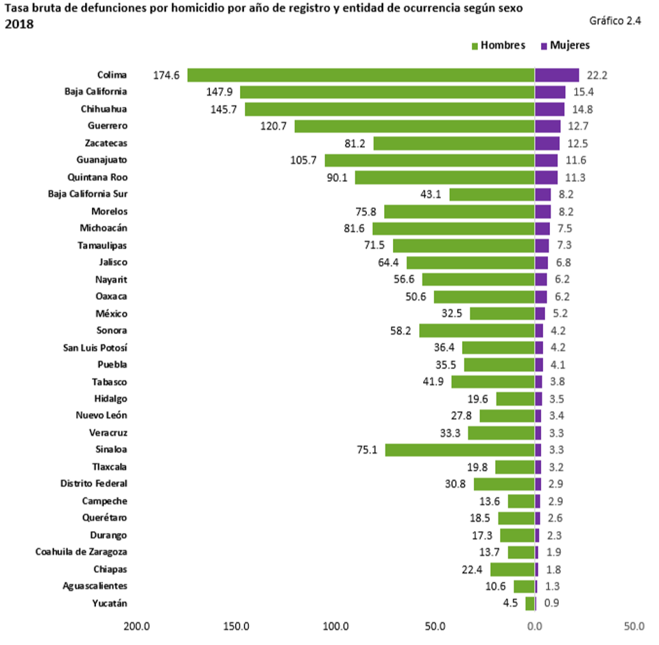 *En los últimos tres años (2016-2018) las entidades que presentan las tasas más altas en homicidios de mujeres son Colima, Baja California, Chihuahua, Guerrero, Zacatecas, Guanajuato, Quintana Roo, Baja California Sur, Morelos, Michoacán de Ocampo, Tamaulipas, Jalisco, Nayarit y Oaxaca.
