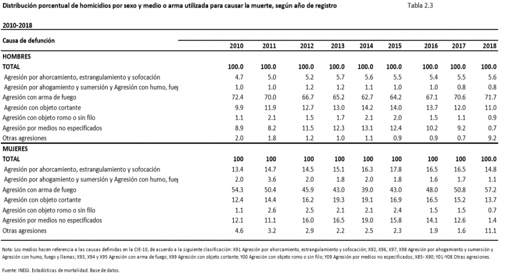 De acuerdo con la información disponible sobre el medio o arma utilizada para causar la muerte de la persona, se aprecia que el medio más utilizado son las armas de fuego. Sin embargo, existe una diferencia relevante por sexo, ya que mientras los homicidios contra los hombres han sido perpetrados en su mayoría con arma de fuego, en el orden de 72 de cada 100 de ellos en 2018, entre las mujeres fue de 57.2 por ciento. En cambio, 30 de cada 100 mujeres fue estrangulada, ahorcada o sofocada, ahogada, quemada, golpeada con algún objeto o herida con un arma punzocortante; la proporción es mayor que entre los hombres (18.3%).