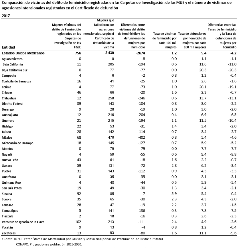 Al comparar la información proveniente de las estadísticas vitales, correspondientes a las defunciones por homicidio (agresiones intencionales), con los casos registrados como feminicidio en las Procuradurías, destaca la diferencia que indica que son pocos los homicidios de mujeres los que se determinan como feminicidios, tal como se muestra en el cuadro siguiente.