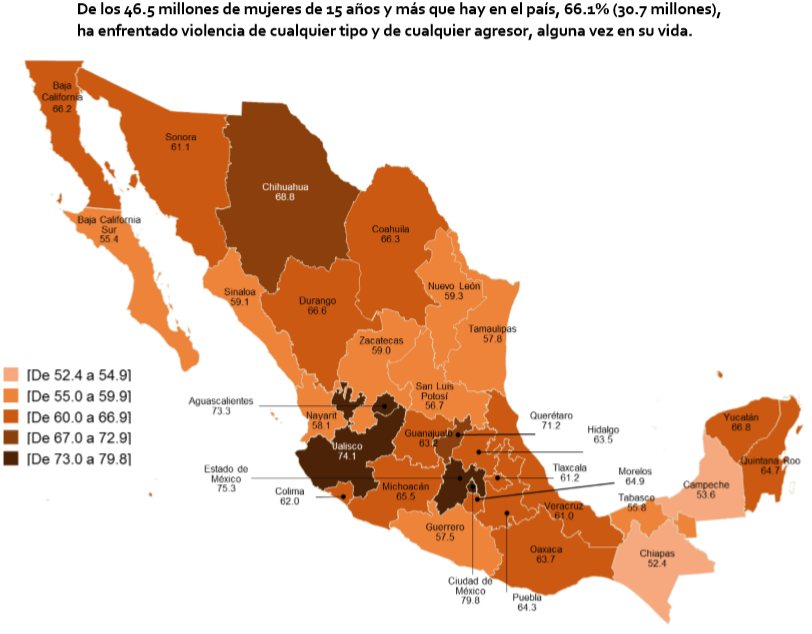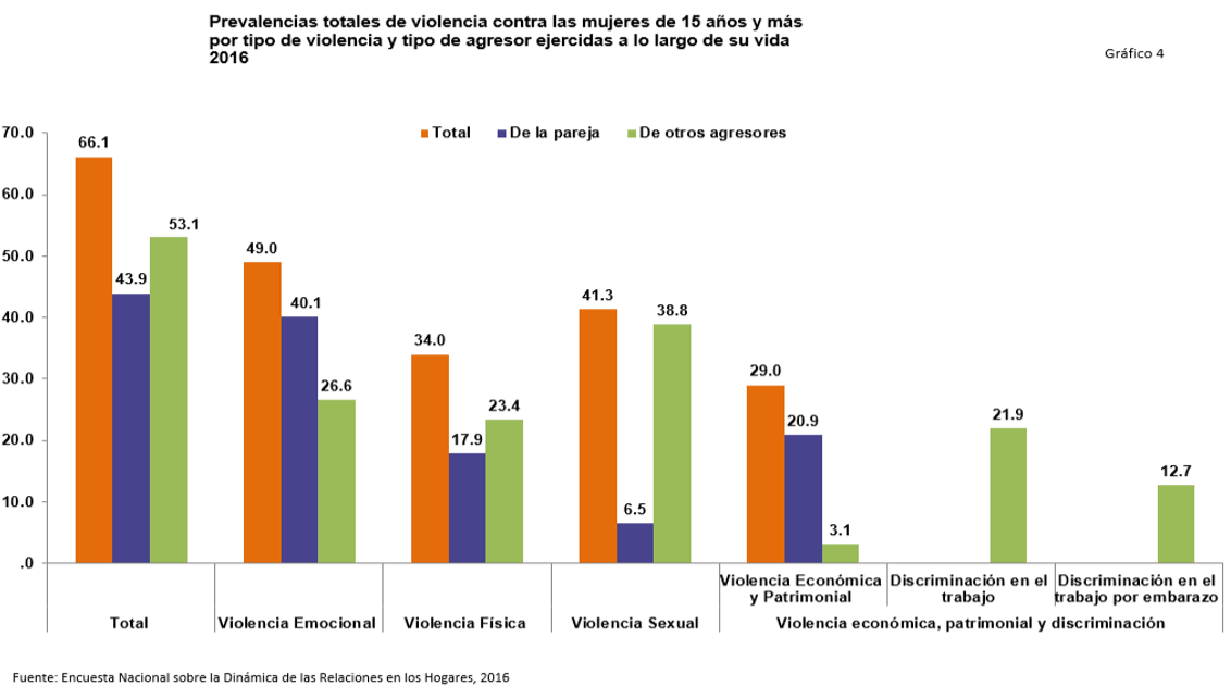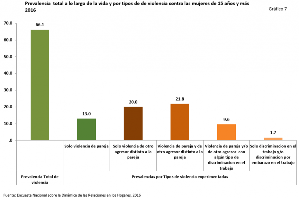 A partir de esta información es posible afirmar que la violencia contra las mujeres es un problema de gran dimensión y una práctica social ampliamente extendida en todo el país, puesto que 66 de cada 100 mujeres de 15 años y más, residentes en el país, han experimentado al menos un acto de violencia de cualquier tipo, ya sea violencia emocional, física, sexual, económica, patrimonial o discriminación laboral, misma que ha sido ejercida por diferentes agresores, sea la pareja, el esposo o novio, algún familiar, compañero de escuela o del trabajo, alguna autoridad escolar o laboral o bien por amigos, vecinos o personas conocidas o extrañas. Esto es, 30.7 millones de mujeres en México han sido sujetas a actos violentos y discriminatorios alguna vez, a lo largo de su vida.