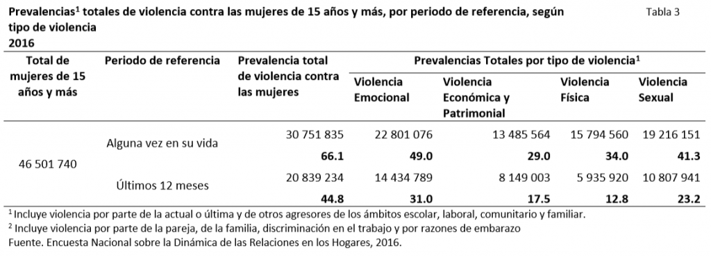 Los resultados de la Endireh permiten determinar la prevalencia de la violencia entre las mujeres de 15 años y más. A partir de  esta información es posible afirmar que la violencia contra las mujeres es un problema de gran dimensión y una práctica social ampliamente extendida en todo el país, puesto que 66 de cada 100 mujeres de 15 años y más, residentes en el país, han experimentado al menos un acto de violencia de cualquier tipo, ya sea violencia emocional, física, sexual, económica, patrimonial o discriminación laboral, misma que ha sido ejercida por diferentes agresores, sea la pareja, el esposo o novio, algún familiar, compañero de escuela o del trabajo, alguna autoridad escolar o laboral o bien por , amigos, vecinos o personas conocidas o extrañas permiten determinar la prevalencia de la violencia entre las mujeres de 15 años y más.