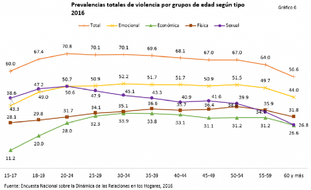 Las mujeres que se encuentran más expuestas a la violencia de la pareja o de cualquier otro agresor son las mujeres jóvenes y de edades medias entre 20 y 39 años, particularmente entre aquellas de 20 a 34 años, ya que 70 de cada 100 mujeres de esas edades han enfrentado al menos un episodio de violencia o abuso.