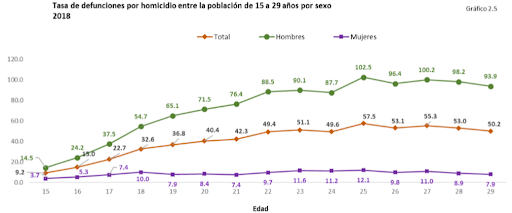 De las muertes por agresiones intencionales, la tasa más alta se ubica en las mujeres de 25 años, con 12 por cada cien mil, mientras que entre los hombres es de 102.5 por cada cien mil en este grupo. En el ámbito estatal, las tasas más altas de defunciones por homicidio de mujeres menores de 30 años se ubican en Colima, Zacatecas, Chihuahua, Guanajuato, Baja California y Quintana Roo, las cuales son más del doble que la media nacional para este grupo, que asciende a 5.0 mujeres menores de 30 años que fallecieron por agresiones intencionales por cada 100 mil de este grupo de edad.