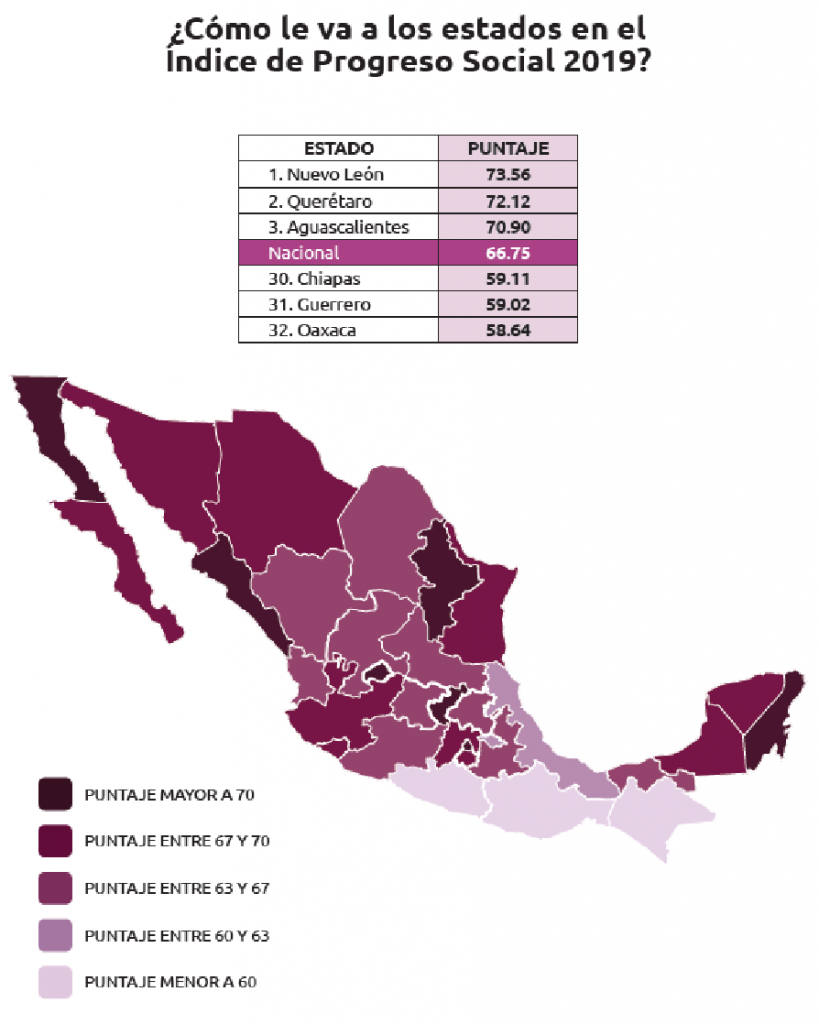 En el Índice de Progreso Social 2019, que mide el desarrollo social de 149 países del mundo, México se ubicó en el lugar 55, muy semejante a la comparación del PIB per cápita en los diferentes países, donde México se ubica en la posición 54. De acuerdo con los resultados del IPS mundial, actualmente se encuentra en la categoría de progreso social “Medio Alto”. Otros países con nivel similar son Ecuador, Perú, Albania y Armenia.