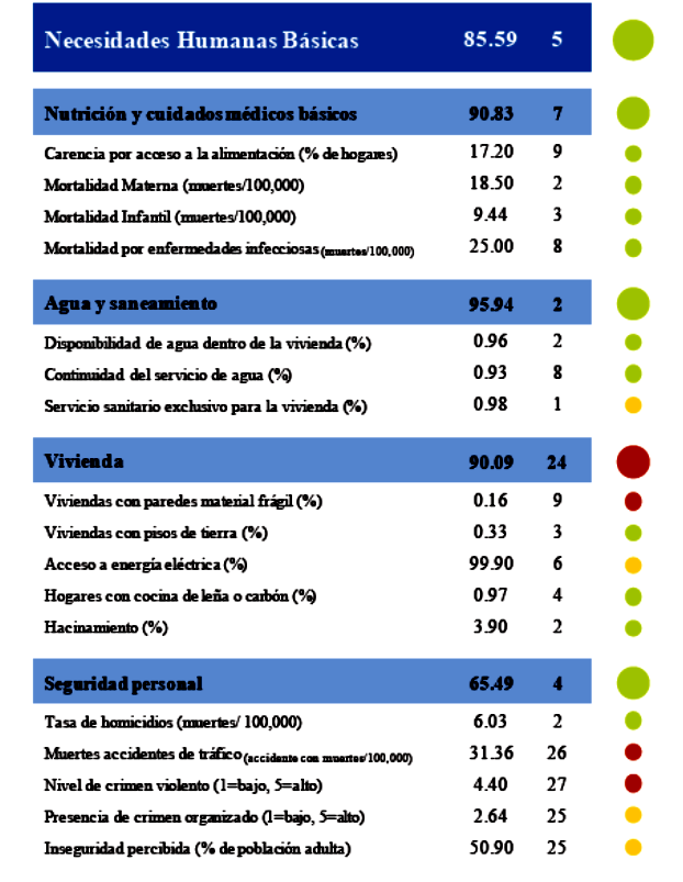 El Índice de Progreso Social contiene 70 indicadores diversos, con los que se construyen las tres dimensiones que lo componen, a saber: las Necesidades Humanas Básicas, los Fundamentos del Bienestar y las Oportunidades.