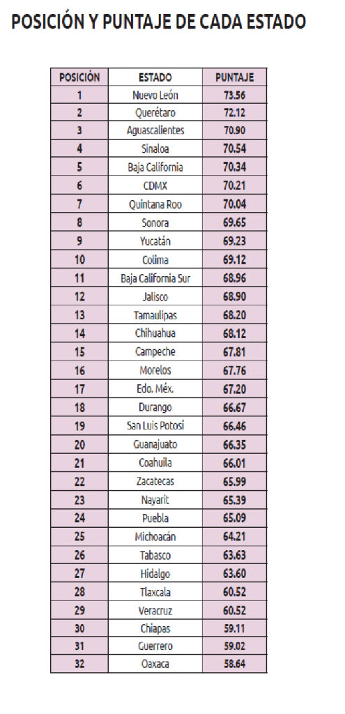 En los valores estatales, Aguascalientes se encuentra en tercer lugar sólo debajo de los de Nuevo León y Querétaro, únicos con más de 70 puntos y con niveles de Progreso Social semejantes a los de Uruguay, país que ha basado en gran medida su desarrollo en la participación ciudadana.