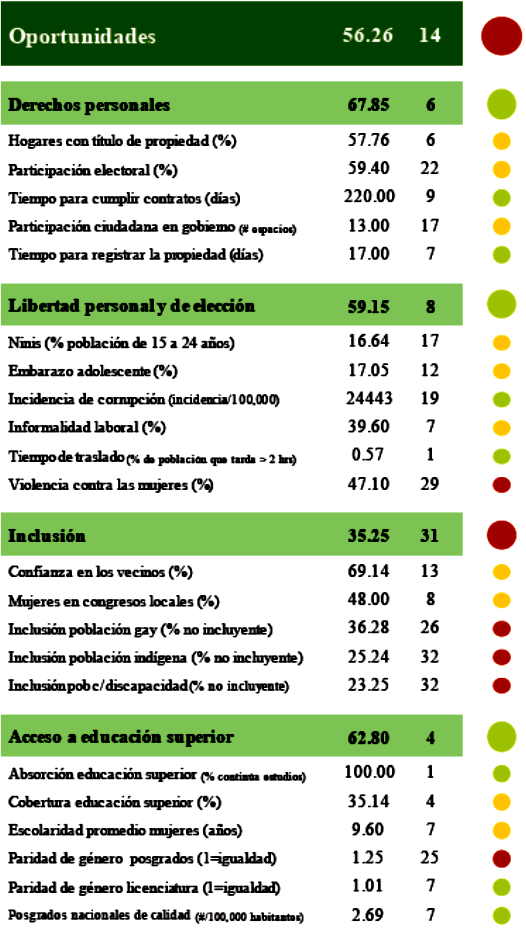 Sobre las denominadas Oportunidades, Aguascalientes se encuentra bajo, como Puebla y Ucrania; si bien presenta avance en algunos rubros medidos por el tiempo como: el tiempo de traslado de las personas; el tiempo para registrar la propiedad (17 días) y los hogares que, con el tiempo, se han hecho de su título de propiedad (57%).