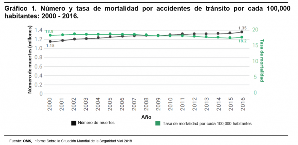 De acuerdo con el Informe Sobre la Situación Mundial de la Seguridad Vial 2018, emitido por la OMS, el número de muertes por accidentes de tránsito continúa en aumento, llegando a un máximo de 1.35 millones para 2016, sin embargo, la tasa de mortalidad con relación al tamaño de la población mundial se ha estabilizado. Como se muestra en el gráfico 1, a pesar del aumento en números absolutos, la tasa de mortalidad por accidentes de tránsito se ha mantenido constante en alrededor de 18 decesos por cada 100,000 habitantes en los últimos 15 años. Si bien esto sugiere que el problema no está creciendo, el mundo está lejos de alcanzar la meta planteada por la ONU en los ODS, que conlleva una reducción a la mitad en la cantidad de muertes para 2020.