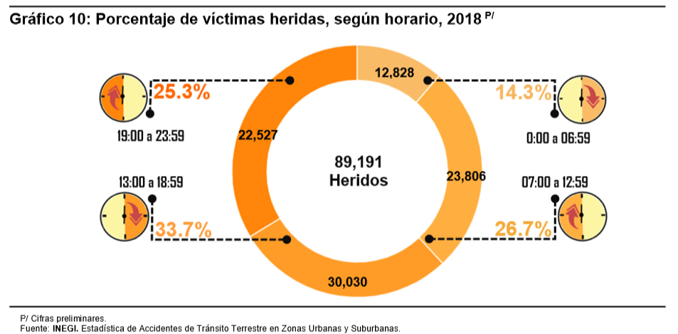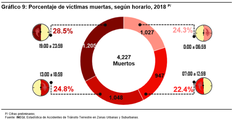 Conforme al horario de ocurrencia del accidente, entre las 19:00 y las 23:59 horas fallecieron 1,205 personas, lo que representa el 28.5% del total de las víctimas fatales. Por otra parte, las personas fallecidas en accidentes ocurridos entre las 13:00 y 18:59 horas, asciende a 1,048 (24.8%). Por lo anterior, durante la tarde y la noche se registran el 53.3% del total de los decesos.