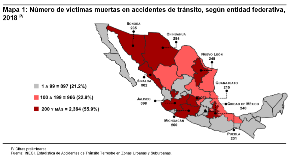 • En 2018 los estados con mayor número de fallecidos por accidentes de tránsito en el lugar de los hechos fueron Jalisco, Sinaloa, Chihuahua, Nuevo León, Ciudad de México, Sonora, Puebla, Guanajuato y Michoacán