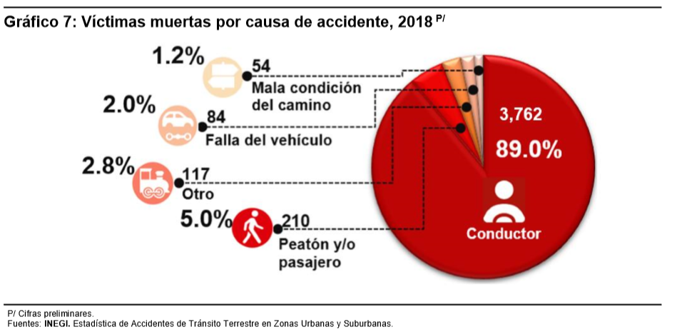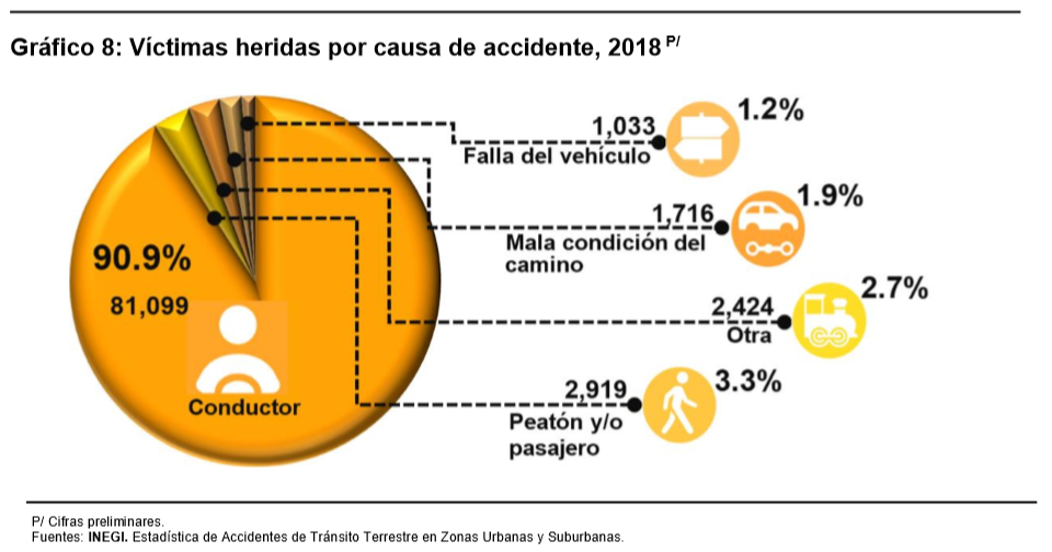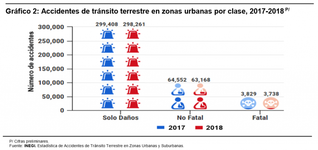 De acuerdo con los resultados de la estadística de Accidentes de Tránsito Terrestre en Zonas Urbanas, en 2018 se reportaron 365,167 accidentes, de los cuales 298,261 corresponden a solo daños (81.7%); 63,168 a eventos viales en los que se identificaron víctimas heridas (17.3%), y los 3,738 accidentes restantes corresponden a eventos con al menos una persona fallecida (1.0 por ciento).