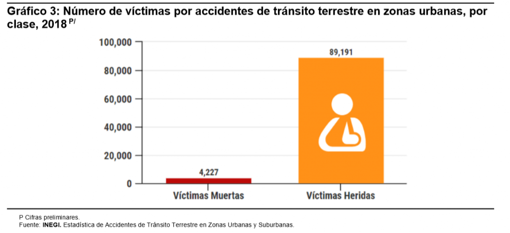En 2018, el total de víctimas registradas en los accidentes de tránsito fue de 93,418, de las cuales 4,227 fallecieron en el lugar del accidente (4.5%) y 89,191 presentaron algún tipo de lesión (95.5 por ciento).