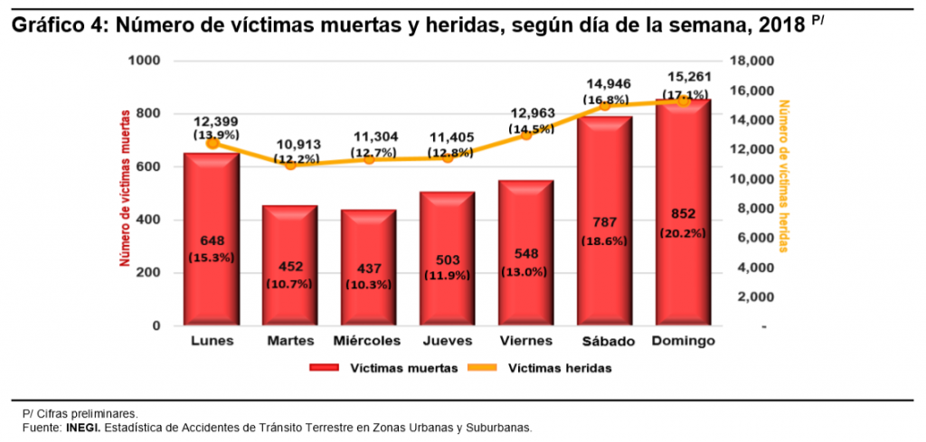 Los días que reportan la mayor cantidad de víctimas muertas y lesionadas son, en primer lugar, el domingo, en que se registran el 20.2% de las víctimas mortales y el 17.1% de los lesionados. En segundo lugar, el sábado con 18.6% de los fallecidos y 16.8% de personas heridas y, en tercer lugar, el lunes con 15.3% de personas fallecidas y 13.9% de los heridos. Estos tres días concentran casi la mitad de las víctimas heridas (47.8%) y más de la mitad de fallecimientos en el lugar del accidente (54.1 por ciento).