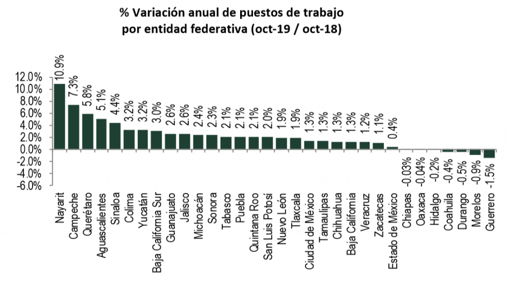 Al 31 de octubre de 2019 se tienen registrados ante el Instituto Mexicano del Seguro Social 20,727,424 puestos de trabajo; de éstos, el 85.6% son permanentes y el 14.4% eventuales. En los últimos años, estos porcentajes se han mantenido relativamente constantes.