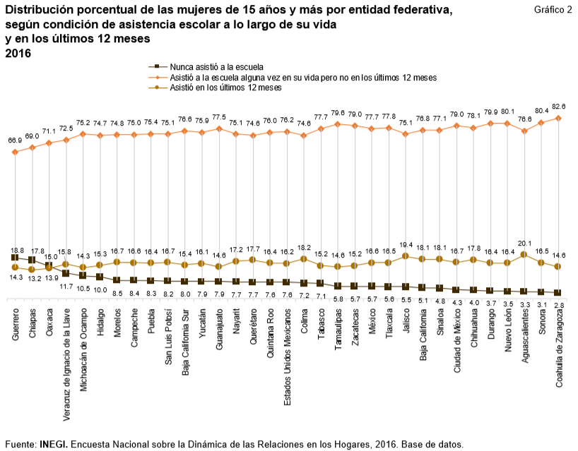 En Aguascalientes, 3.3% de las mujeres de 15 años y más nunca han asistido a la escuela; al interior del país, las entidades de Hidalgo, Michoacán de Ocampo, Veracruz de Ignacio de la Llave, Oaxaca, Chiapas y Guerrero presentan porcentajes entre 10.0 y 18.8 por ciento; por el contrario, Sinaloa, Ciudad de México, Chihuahua, Durango, Nuevo León, Aguascalientes, Sonora y Coahuila de Zaragoza registran porcentajes menores a cinco por ciento.