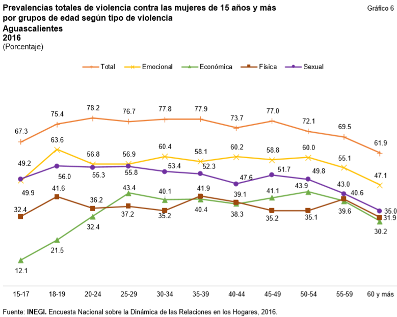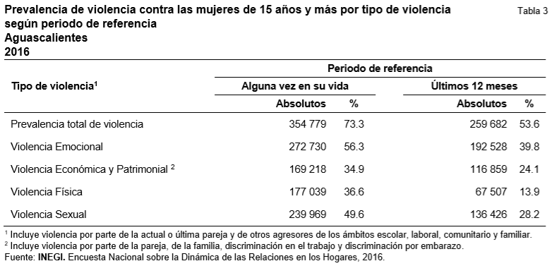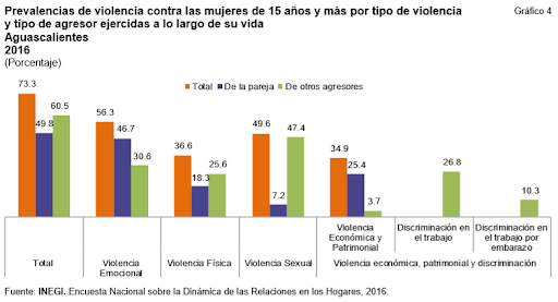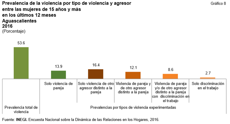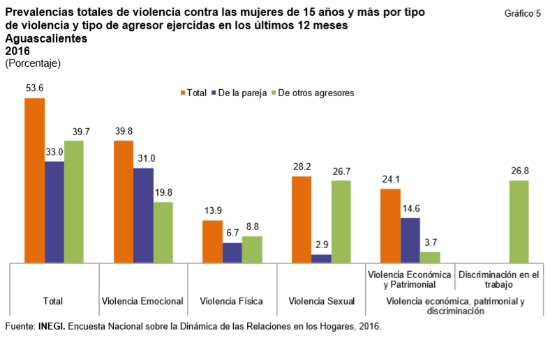 En cuanto a la violencia que experimentaron las mujeres de 15 años y más durante los 12 meses anteriores a la fecha de levantamiento de la encuesta, es decir, entre octubre de 2015 y octubre de 2016, en el estado de Aguascalientes, la mitad de las mujeres fueron víctimas de algún acto violento, principalmente de tipo emocional y sexual. En el caso de la violencia emocional el perpetrador es principalmente la pareja o última pareja; mientras que, la violencia sexual ha sido ejercida en su gran mayoría, por agresores distintos a la pareja o expareja.