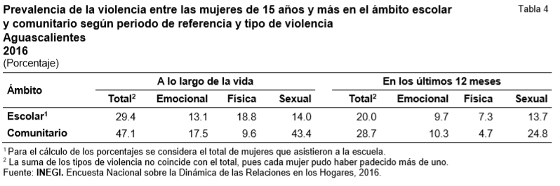 Los espacios públicos continúan siendo un riesgo para las mujeres. De acuerdo con los datos de la Endireh 2016, de las mujeres de 15 años y más de Aguascalientes que han asistido a la escuela, 29.4% han sufrido violencia en este ámbito a lo largo de su vida, siendo la violencia física la de mayor frecuencia, con 18.8 por ciento; sin embargo, al considerar solamente los últimos 12 meses, la violencia sexual (13.7%) la han experimentado con mayor frecuencia.