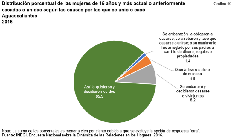 Entre las causas por las que las mujeres en Aguascalientes se casaron o unieron destacan dos elementos importantes; si bien la mayoría lo hizo por su propia voluntad (85.9%), 1.4% de las mujeres se unió a su actual esposo o pareja porque fue obligada a hacerlo porque se embarazó, se la robaron, o se arregló su unión a cambio de dinero o bienes.