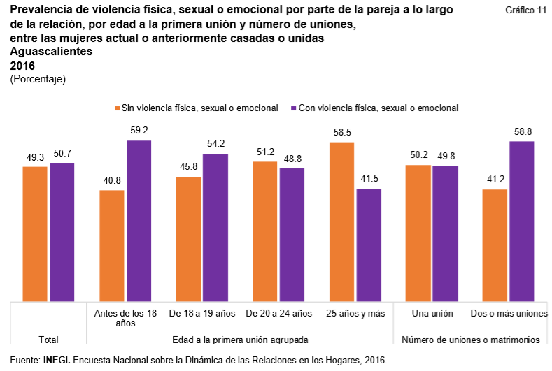 Otro elemento a tener en cuenta son el número de uniones o matrimonios que tienen las mujeres en su historia, y es muy significativo que entre las mujeres mexicanas, la gran mayoría solo ha estado casada o unida una vez (88.2%) y sólo una de cada diez mujeres se ha casado o unido al menos dos veces. Para la entidad de Aguascalientes, de las mujeres alguna vez unidas, 90.5% solo lo han hecho una vez y 9.5% más de una.