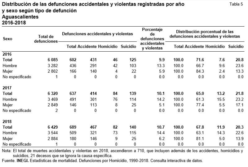 En el trienio de 2016-2018, en Aguascalientes se registró el fallecimiento de 18,834 personas, de las cuales 45.3% eran mujeres. Considerando este periodo, se registraron anualmente en promedio 643 defunciones por accidentes o por hechos violentos.