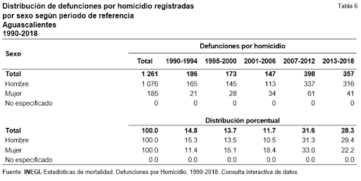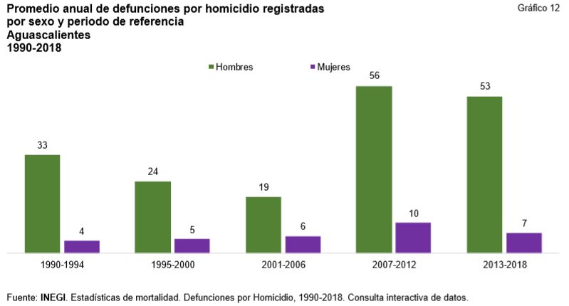 Al revisar las defunciones por homicidio ocurridas en el periodo 1990-2018 y agruparlas por intervalos, en promedio se registró en Aguascalientes el homicidio de 21 mujeres en los periodos 1990-1994, 28 en 1995-2000, 34 en 2001-2006; para el periodo 2007-2012 la cifra ascendió a 61 mujeres; y entre 2013 y 2018 la cifra descendió a 41 mujeres.