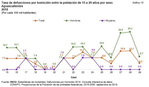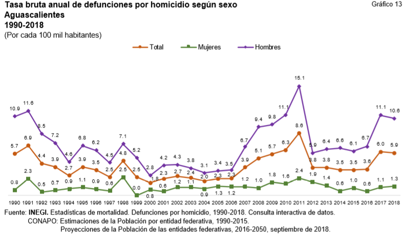 Para 2018, la tasa de defunciones por homicidio de mujeres menores de 30 años en Aguascalientes es de 1.6 por cada 100 mil mujeres. En el ámbito nacional, Colima, Zacatecas, Chihuahua, Guanajuato, Baja California y Quintana Roo, se ubican en el estrato más alto, con tasas mayores a 10 homicidios por cada 100 mil en ese rango de edad.