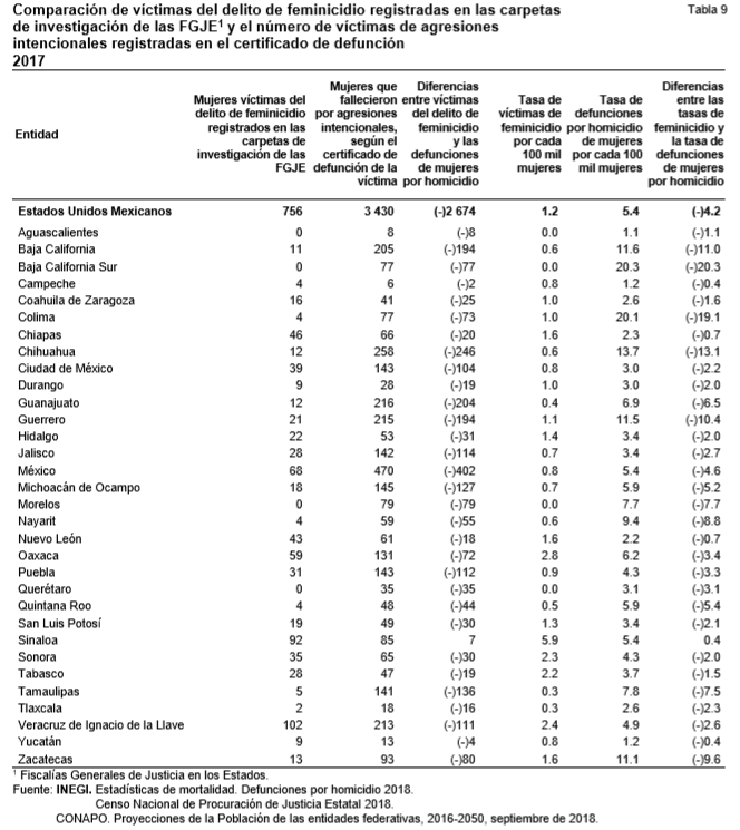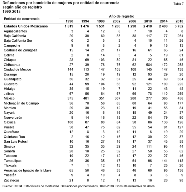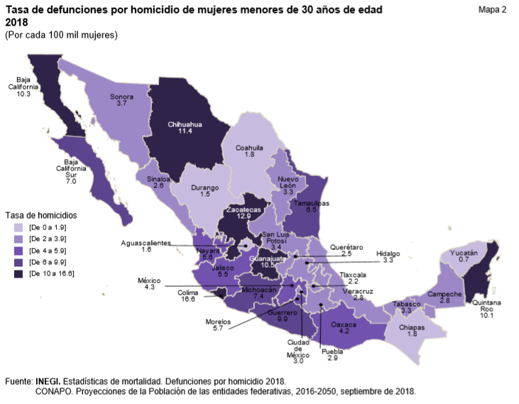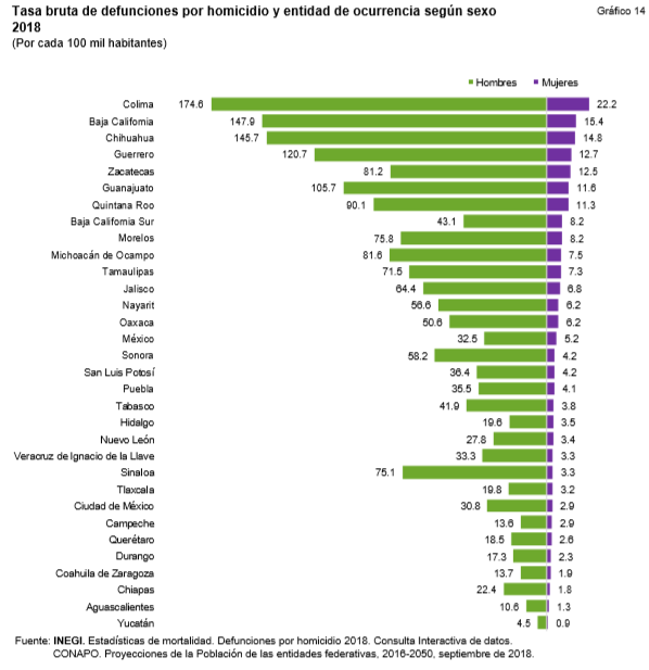 En 2018, las tasas brutas de defunciones por homicidio muestran una amplia diferencia, tanto por sexo, como por entidad federativa de ocurrencia. Ejemplo de ello es el estado de Colima que ocupa el primer lugar a nivel nacional con 22.2 homicidios por cada 100 mil mujeres; por el contrario, Yucatán presenta la tasa más baja de 0.9 por cada 100 mil mujeres.