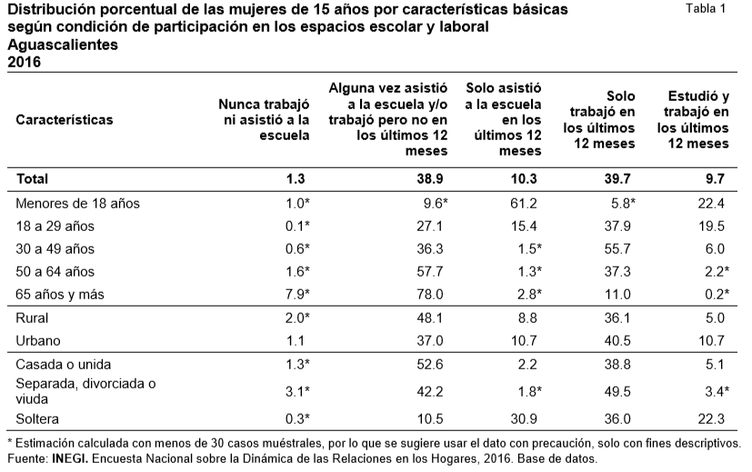 Los datos muestran diferencias generacionales importantes. Mientras más joven es la mujer, mayor es su participación en ambos ámbitos. En Aguascalientes, 1.3% de las mujeres de 15 años y más nunca han trabajado ni asistido a la escuela; mientras que, entre las mujeres de 65 años y más, esta proporción es de 7.9 por ciento.