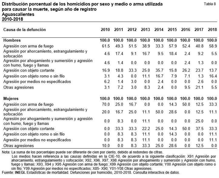 De acuerdo con la información disponible sobre el medio o arma utilizada para causar la muerte de la persona, se aprecia que el medio más utilizado son las armas de fuego. Sin embargo, existe una diferencia relevante por sexo, en Aguascalientes 59 de cada 100 homicidios registrados durante 2018 contra los hombres, fueron perpetrados con arma de fuego; mientras que entre las mujeres esta proporción fue de 33 de cada 100.