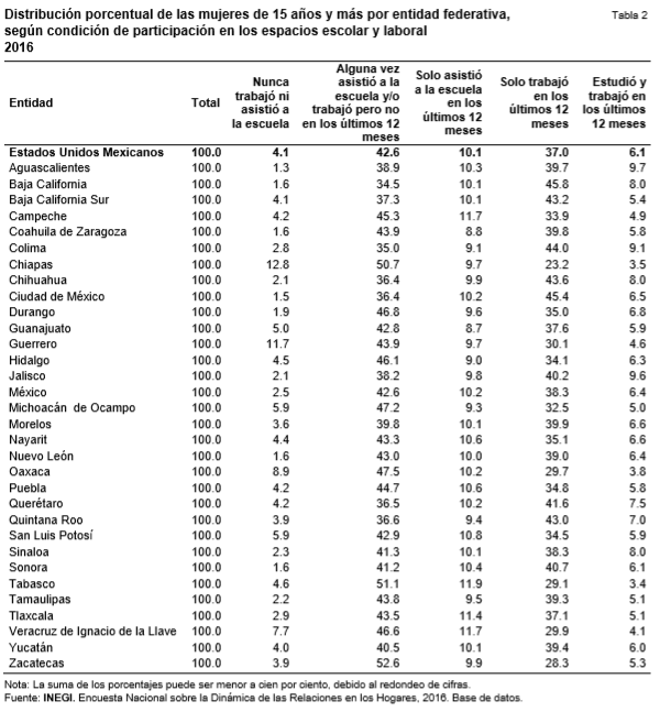 Para 2016, a en el ámbito nacional 95.9% de las mujeres de 15 años y más han asistido a la escuela o han trabajado alguna vez en su vida, pero sólo poco más de la mitad lo hizo en los últimos 12 meses. Sin embargo, los datos muestran que esta situación varía en función de la entidad, la edad, el tipo de localidad en que viven, lo que muestra situaciones diferenciadas y de mayor desigualdad.
