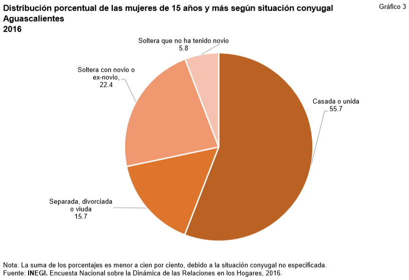 Según la Endireh 2016, del total de las mujeres de 15 años y más en Aguascalientes, el 93.9% mantiene o mantuvo una relación de pareja, ya sea por unión o matrimonio (55.7% están actualmente casadas o unidas y 15.7% actualmente están separadas, divorciadas o viudas de su última relación con quien estuvieron casadas o unidas), o bien de pareja o noviazgo sin cohabitar (22.4%); y solo 5.8% no ha tenido ninguna relación de pareja.